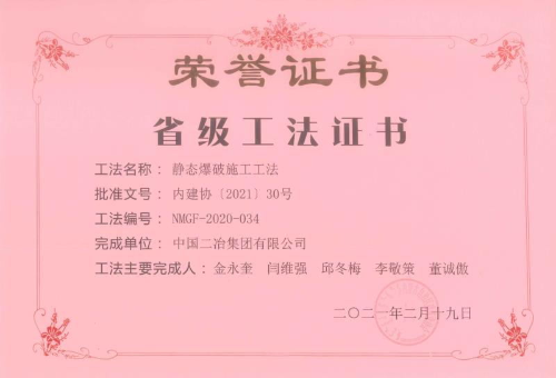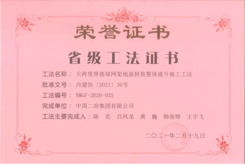 八項工法分別為市政分公司《靜態爆破施工工法》;鋼結構公司《大跨度焊接球網架地面拼裝整體提升施工工法》;路橋分公司《斜拉橋主塔交匯處鋼箱梁結構托架施工工法》;城建分公司《壓型鋼板非組合樓板施工工法》;管道分公司《管道深基坑支護綜合施工工法》;陜西分公司《單側支模條件下槽式預埋件安裝施工工法》;冶金分公司《高鐵站承軌鋼結構制作施工工法》及《彩色印花機組活套設備安裝施工工法》。
