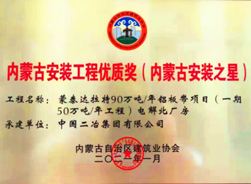 近日,由中國(guó)二冶鋼構(gòu)分公司施工的蒙泰達(dá)拉特鋁板帶項(xiàng)目(一期50萬(wàn)噸電解鋁工程),被內(nèi)蒙古自治區(qū)建筑業(yè)協(xié)會(huì)評(píng)選為內(nèi)蒙古安裝工程優(yōu)質(zhì)獎(jiǎng)(內(nèi)蒙古安裝之星)。