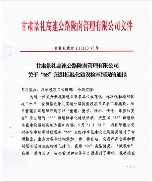 6月15日,景禮項目部在項目管理公司組織的6S班組標準化建設檢查中名列前茅,為此,項目管理公司對景禮六標項目部進行通報表揚,并給予獎勵20萬元。