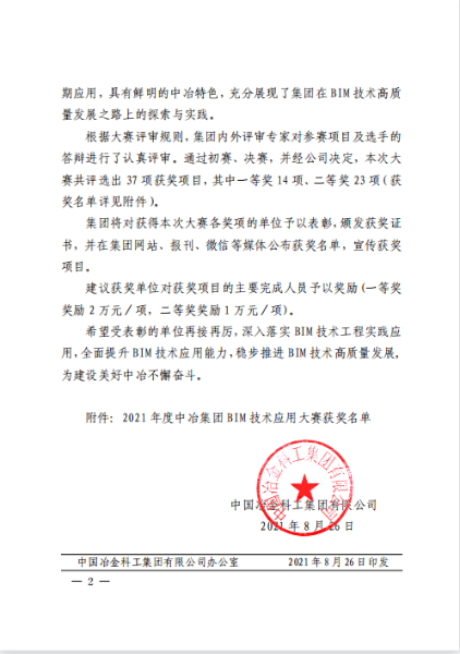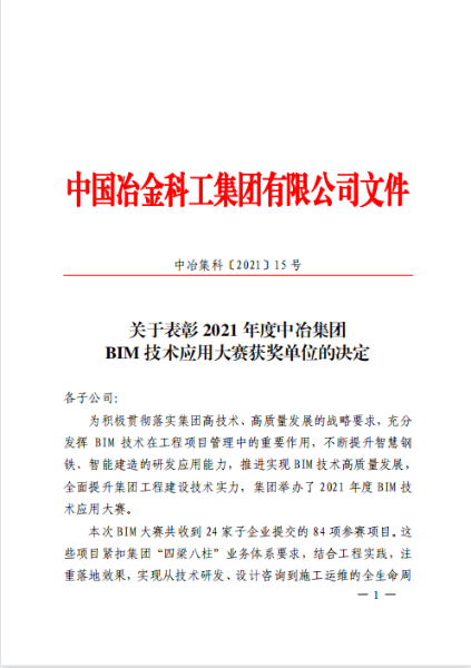 8月26日,中冶集團(tuán)〔2021〕5號文件《關(guān)于表彰2021年度中冶集團(tuán)BIM技術(shù)應(yīng)用大賽獲獎單位的決定》揭曉獲獎名單,中國二冶包頭市實(shí)訓(xùn)基地項(xiàng)目《包頭高技能人才公共實(shí)訓(xùn)基地項(xiàng)目BIM技術(shù)應(yīng)用》在本次大賽中榮獲“2021年度中冶集團(tuán)BIM技術(shù)應(yīng)用大賽二等獎”。