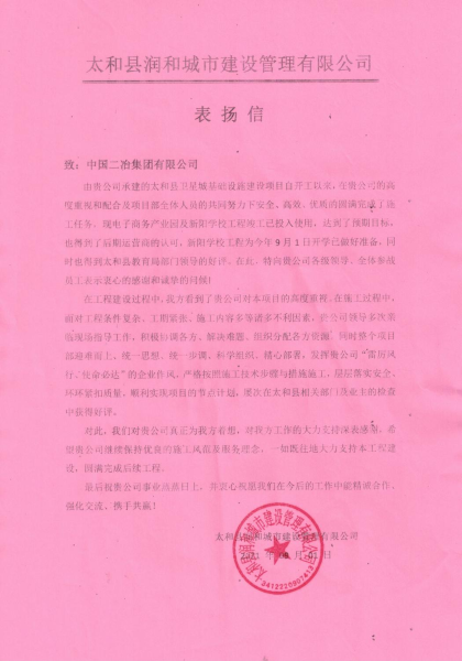 信中太和縣潤(rùn)和城市建設(shè)管理有限公司對(duì)中國(guó)二冶在各方面的工作支持深表感謝,希望中國(guó)二冶繼續(xù)保持優(yōu)良的施工風(fēng)范及服務(wù)理念,一如既往地大力支持該工程建設(shè),圓滿完成后續(xù)工程。并表示愿與中國(guó)二冶集團(tuán)有限公司在今后的工作中能精誠(chéng)合作,共鑄輝煌!