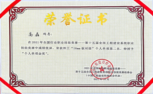 12月18日至21日,2021年全國行業職業技能競賽第十五屆全國工程建設系統職業技能競賽焊工和無損檢測員項目競賽在山西省大同舉行。中國二冶青年員工高磊在比賽中榮獲個人焊接單項金獎。