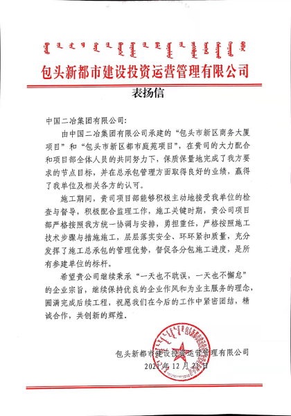 12月21日,包頭新都市建設(shè)投資運營管理有限公司致中國二冶表揚信。衷心感謝中國二冶各級領(lǐng)導和全體員工的共同努力,保質(zhì)保量完成包頭市新都市區(qū)商務(wù)大廈、新都市區(qū)都市庭苑項目各項網(wǎng)絡(luò)節(jié)點目標,取得良好業(yè)績,贏得各方的稱贊和認可。