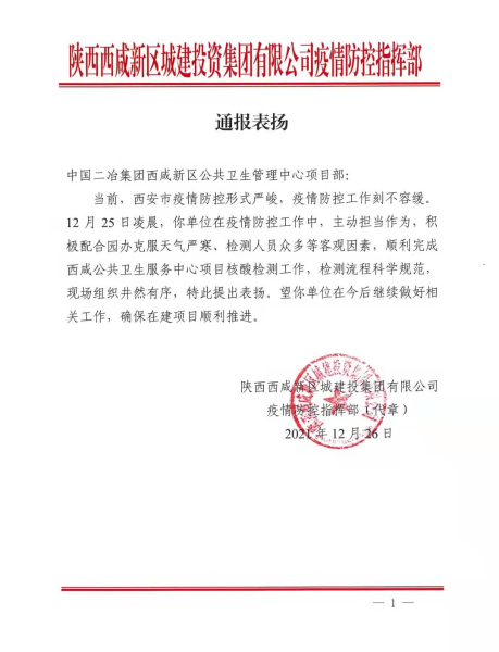 表揚(yáng)信中說到,當(dāng)前西安市疫情防控形勢嚴(yán)峻,疫情防控工作刻不容緩。12月25日凌晨,中國二冶西咸新區(qū)公共衛(wèi)生管理中心項(xiàng)目部在疫情防控工作中,主動(dòng)擔(dān)當(dāng)作為,積極配合園辦克服天氣嚴(yán)寒、檢測人員眾多等客觀因素,順利完成西咸公共衛(wèi)生服務(wù)中心項(xiàng)目核酸檢測工作,檢測流程科學(xué)規(guī)范,現(xiàn)場組織井然有序。信中還說,希望西咸新區(qū)公共衛(wèi)生管理中心項(xiàng)目部在今后繼續(xù)做好相關(guān)工作,確保在建項(xiàng)目順利推進(jìn)。