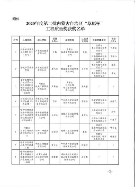 近日,內(nèi)蒙古自治區(qū)住房和城鄉(xiāng)建設(shè)廳官網(wǎng)公示2020年度內(nèi)蒙古自治區(qū)“草原杯”工程質(zhì)量獎(jiǎng)名單,中國二冶內(nèi)蒙古分公司承建的內(nèi)蒙古自治區(qū)綜合疾病預(yù)防與控制中心項(xiàng)目、呼市呼倫路跨小黑河橋同時(shí)榮獲2020年度第二批內(nèi)蒙古自治區(qū)“草原杯”工程質(zhì)量獎(jiǎng)。