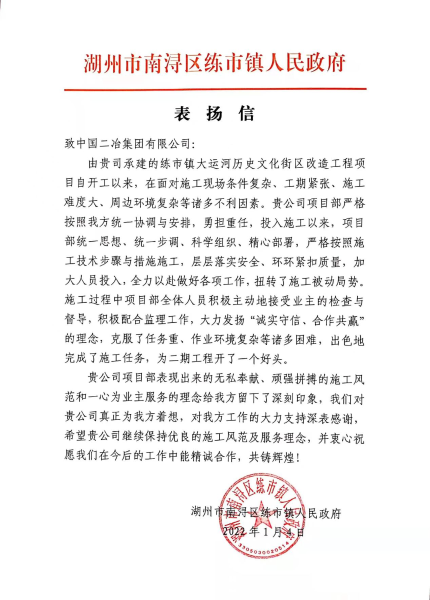 1月4日,湖州市南潯區(qū)練市鎮(zhèn)人民政府致中國二冶表揚信,對中國二冶路橋分公司大運河項目部無私奉獻、頑強拼搏的施工風范和一心為業(yè)主服務(wù)的理念表示感謝。