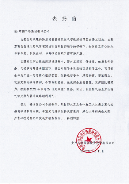 貴州東黎投資股份有限公司在表揚信中指出,在凱里至爐山段線路建設過程中,面對工期緊、任務重、地質條件復雜、氣候多雨等諸多困難下,中國二冶領導多次親臨現場指導工作,項目部全體員工統一思想精細組織管理,合理調配資源,強化安全質量管理、發揮團隊凝聚力,按照計劃節點日期完成施工任務,保證了凱里輸氣站至爐山輸氣站天然氣管道線路順利通氣,在此向中國二冶表示衷心的感謝和誠摯的問候。同時,希望中國二冶繼續發揚誠信履約、顧全大局的央企風范,與我方實現合作共贏,圓滿完成施工任務。