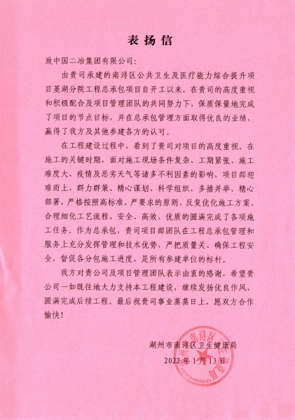 中國二冶收到湖州市南潯區(qū)衛(wèi)生健康局表揚(yáng)信