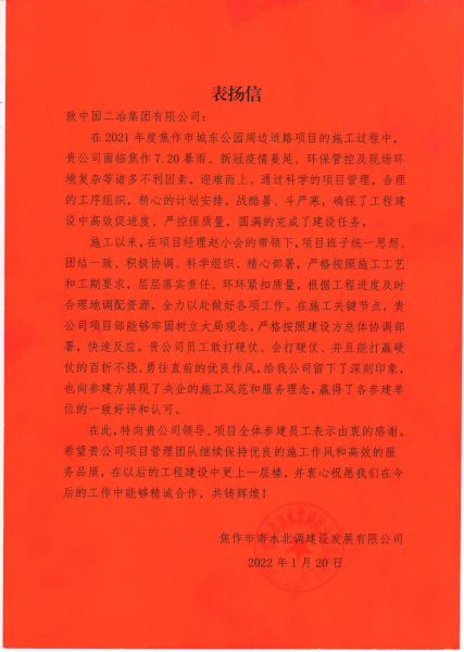1月21日,焦作市南水北調建設發展有限公司致中國二冶集團焦作市城東公園周邊道路建設工程項目經理部表揚信,對焦作市城東公園周邊道路建設工程項目在2021年防汛工作、疫情防控、施工管理、環保管控等方面表現出來的頑強拼搏、無私奉獻的優良作風表示高度贊揚。