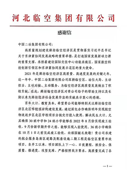 1月21日,中國二冶廊坊航空物流起步區北區學校工程項目、廊坊航空物流起步區南區道路工程項目收到來自甲方河北臨空集團有限公司發來的表揚信。