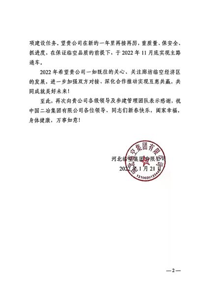 信中指出,在過去的一年里,中國二冶深耕臨空區,站位大局、主動擔當、主動對接、主動服務,為臨空經濟區高質量發展做出了積極貢獻。中國二冶臨空經濟區學校與道路兩項目部積極克服諸多建設難題,科學組織、搶抓工期,全力以赴推進項目建設,高質量完成各項建設任務。希望項目部永葆初心使命,雷厲風行、使命必達,繼續高標準、高質量完成后續建設任務,同時關注廊坊臨空經濟區的發展,進一步加強雙方對接,深化合作推動實現互惠共贏,共同成就美好未來。