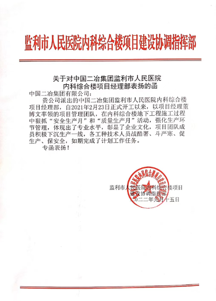 監(jiān)利市人民醫(yī)院在表揚信中指出,自項目開工以來,以項目經(jīng)理董博文率領的項目管理團隊,在內(nèi)科綜合樓地下工程施工過程中狠抓“安全生產(chǎn)月”和“質(zhì)量生產(chǎn)月”活動,強化生產(chǎn)環(huán)節(jié)管理,體現(xiàn)出了專業(yè)水平,彰顯了企業(yè)文化,各工種技術人員戰(zhàn)酷署、斗嚴寒、促生產(chǎn)、保安全,如期完成了計劃工作任務。