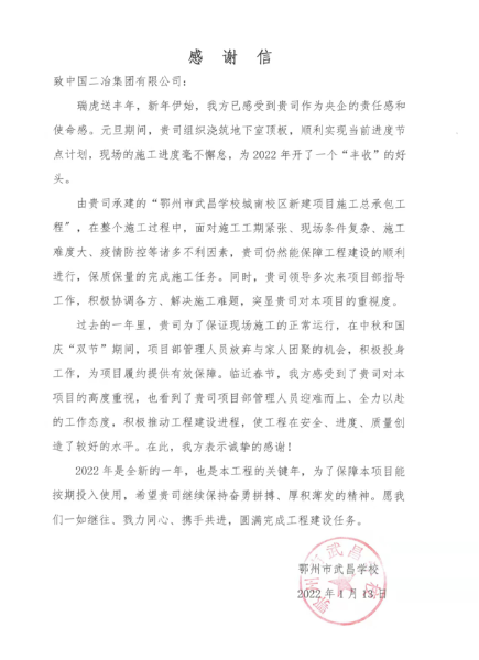 鄂州市武昌學校在表揚信中指出,自項目開工建設以來,中國二冶肩負使命,勇于擔當,突破重重困難,徹底扭轉被動局面,全面完成了現(xiàn)階段工作目標。希望中國二冶一如既往地大力支持工程建設,繼續(xù)履行央企社會責任、經(jīng)濟責任和綠色發(fā)展責任,再接再厲,越戰(zhàn)越勇,勇毅前行,為工程整體竣工做出積極貢獻。