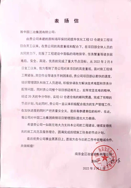 3月1日,南京金江冶金爐料有限公司向中國(guó)二冶致表?yè)P(yáng)信,對(duì)中國(guó)二冶南鋼項(xiàng)目部全體員工在項(xiàng)目施工過程中做出的成績(jī)和頑強(qiáng)拼搏的精神表示高度贊揚(yáng)。