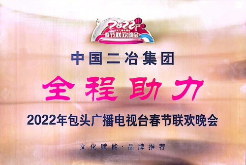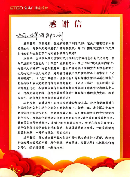 近日,中國二冶收到包頭廣播電視臺感謝信,信中對中國二冶多年來關(guān)心愛護包頭廣播電視發(fā)展,給予包頭廣播電視宣傳工作大力支持表示感謝,對中國二冶在2022年包頭廣播電視臺春節(jié)聯(lián)歡晚會中文化賦能、品牌推介和全程助力表示崇高的敬意。