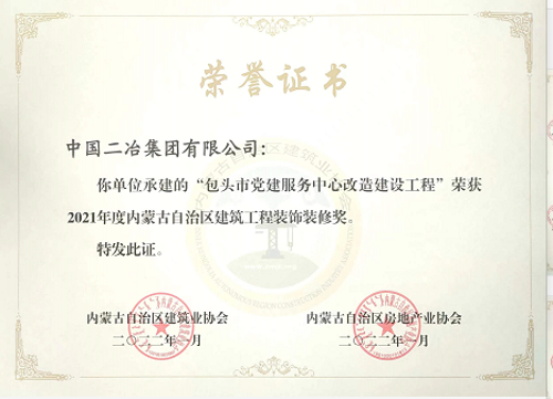 4月11日,中國二冶收到內(nèi)蒙古自治區(qū)建筑協(xié)會、內(nèi)蒙古自治區(qū)房地產(chǎn)協(xié)會發(fā)來的榮譽(yù)證書——中國二承建的包頭市黨建服務(wù)中心改造項目建設(shè)工程榮獲2021年度內(nèi)蒙古自治區(qū)建筑工程裝飾裝修獎。