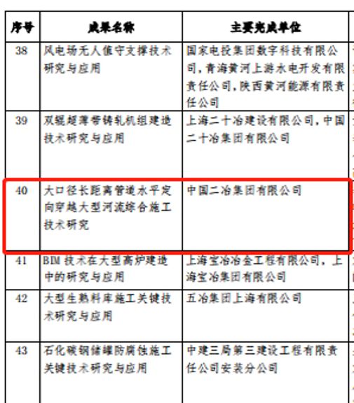 4月12日,中國安裝協(xié)會公布《關(guān)于公布2022年中國安裝協(xié)會科學(xué)技術(shù)進(jìn)步獎評選結(jié)果的通知》的正式文件。中國二冶申報的《大口徑長距離管道水平定向穿越大型河流綜合施工技術(shù)研究》首次斬獲中國安裝協(xié)會科學(xué)進(jìn)步獎二等獎。