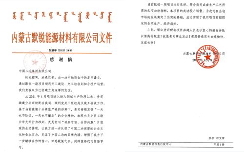 4月8日和12日,中國二冶連續收到內蒙古默銳能源材料有限公司的兩封感謝信,盛贊中國二冶在默銳一期項目建設中,突破工期緊任務重等不利因素,高標準嚴要求,精益求精匠心智造,披荊斬棘打造樣板工程,優質快速完成工程建設任務,充分彰顯冶金建設國家隊的央企責任和擔當。