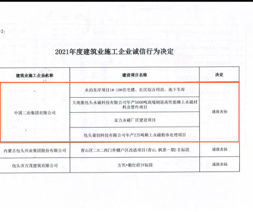 根據考核結果,中國二冶水泊東岸項目、大地熊項目、金力永磁項目、堇創項目的誠信行為受到通報表揚。該考核決定將通過“包頭市建筑市場監管與誠信信息平臺”向社會公布。