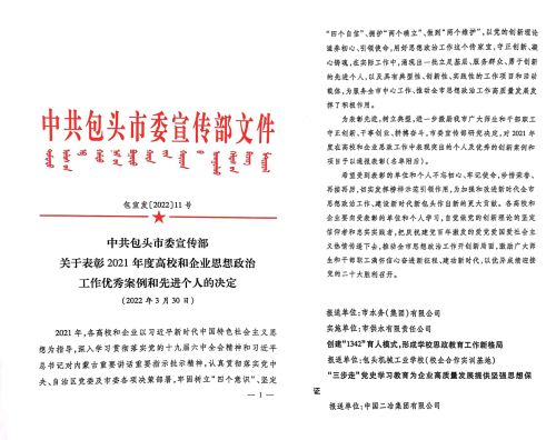 5月12日,中國二冶收到中共包頭市委宣傳部《關于表彰2021年度高校和企業思想政治工作優秀案例和先進個人的決定》通知文件,公司報送的《“三步走”黨史學習教育為企業高質量發展提供堅強思想保證》榮獲“職工思想政治工作優秀案例”。
