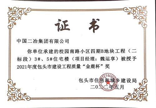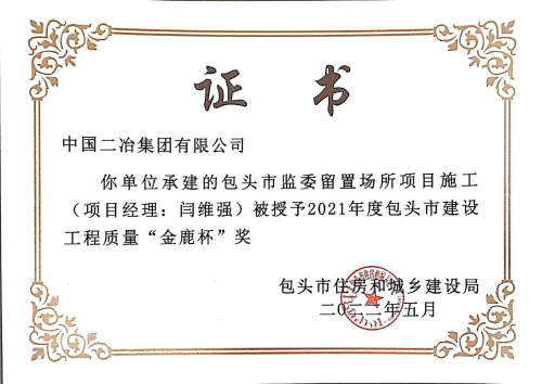 6月1日,中國二冶收到包頭市建筑業協會頒發的榮譽證書,中國二冶金力永磁 (包頭)科技有限公司高性能稀土永磁材料基地、包頭市監委留置場所、校園南路小區四期B地塊工程(二標段)3#、5#住宅樓三項工程喜獲2021年度包頭市“金鹿杯”工程質量獎。