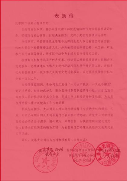 6月8日,甘肅省隴南市禮縣縣委協(xié)調(diào)領(lǐng)導(dǎo)小組辦公室、禮縣新冠肺炎疫情聯(lián)防聯(lián)控領(lǐng)導(dǎo)小組辦公室、禮縣城關(guān)鎮(zhèn)人民政府致中國二冶表揚(yáng)信,對中國二冶景禮高速公路項目部扎根一線,把疫情防控作為當(dāng)前首要政治任務(wù),用實際行動詮釋央企的責(zé)任和擔(dān)當(dāng)表示感謝。