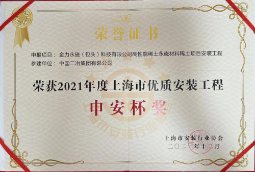 7月26日,中國二冶收到上海市安裝行業協會發來的獲獎證書和獎杯。耕耘二載,由中國二冶承建的金力永磁(包頭)科技有限公司高性能稀土永磁材料基地項目安裝工程榮獲2021年度上海市優質安裝工程“申安杯”獎。