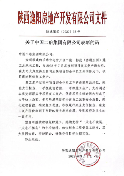 9月1日,中國二冶收到陜西逸陽房地產開發有限公司發來的《關于中國二冶集團有限公司表彰的函》。表彰函充分肯定了中國二冶陜西分公司在樂華住宅首開區二期一標段(香榭莊園)施工總承包項目復工復產以來展現出來的關鍵時刻頂得住,困難面前勇攀登的央企風范。