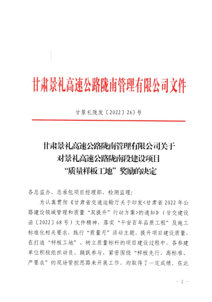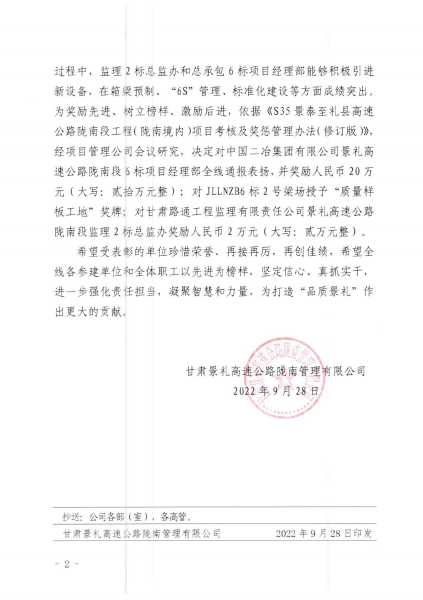 9月28日,甘肅景禮高速公路隴南管理有限公司發(fā)布通報,對中國二冶甘肅分公司景禮項目部在“質量樣板工地”評比中獲得優(yōu)異成績進行通報表揚,景禮項目部二號梁場榮獲“質量樣板工地”獎牌,并給予20萬元嘉獎。