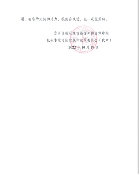 10月19日,受東河區政府委派,東河區新冠疫情指揮部物資保障部、包頭市東河區發展和改革委員會聯合致中國二冶感謝信,表揚中國二冶在這場急、難、險、重的疫情防控硬任務面前,毫不退縮,不畏不懼、不言不棄,沖破困難阻礙,連夜奮戰不間斷,以最快的速度伸出援手,近四百余名職工沖鋒到隔離點改造、防疫隔離點項目建設、在建項目等疫情封控一線,助力東河區政府疫情防控工作取得階段性成果。特向中國二冶干部職工致以崇高敬意和衷心感謝!