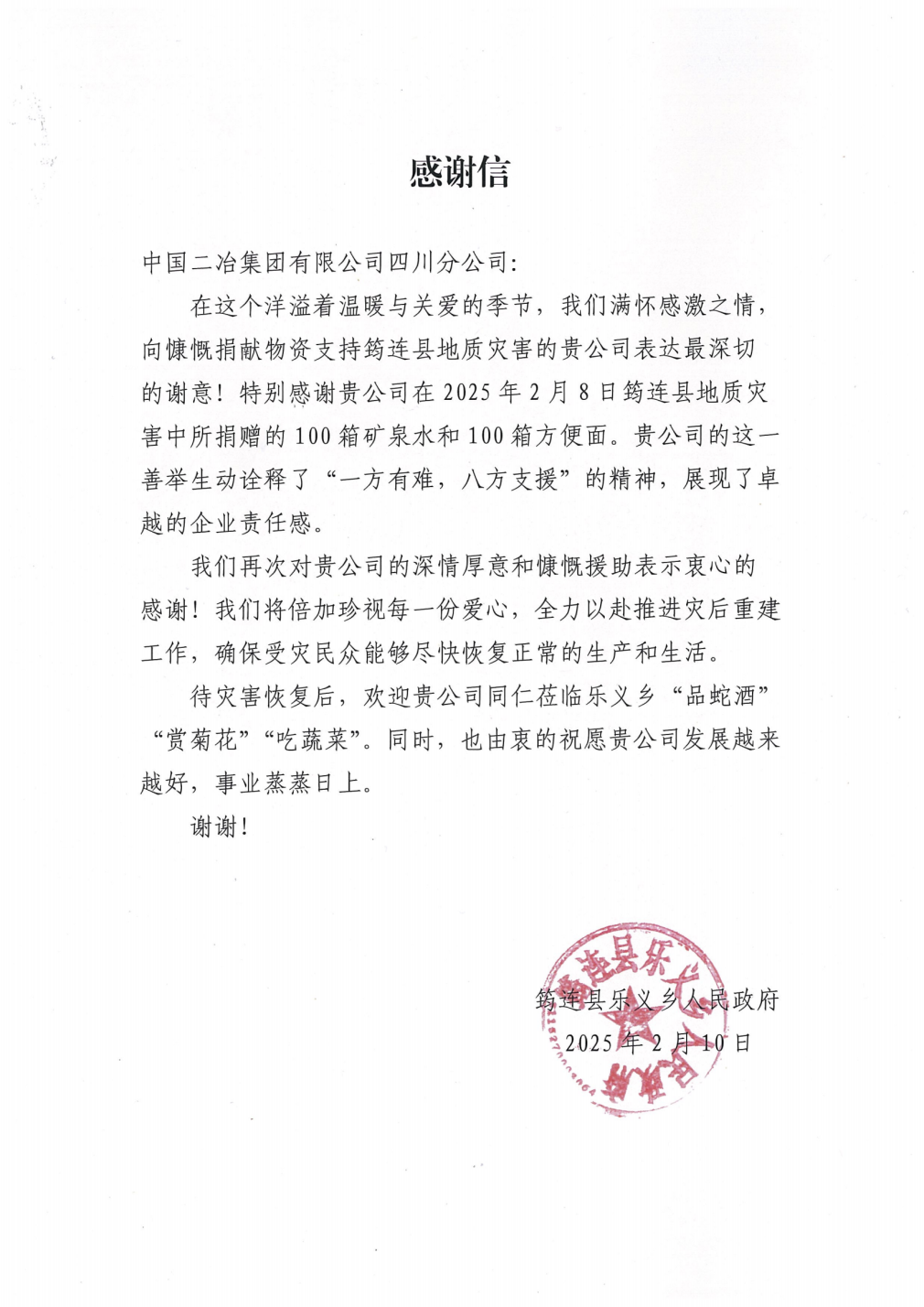 2月10日,中國二冶收到四川省宜賓市筠連縣樂義鄉(xiāng)人民政府感謝信,對中國二冶捐贈物資支持宜賓市筠連縣山體滑坡?lián)岆U(xiǎn)救援工作表示敬意和感謝!