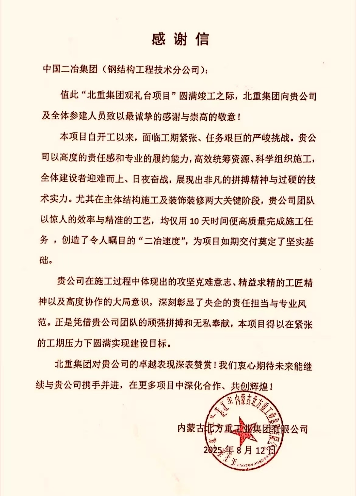 8月12日,內(nèi)蒙古北方重工業(yè)集團(tuán)有限公司向中國(guó)二冶發(fā)來(lái)感謝信,對(duì)中國(guó)二冶鋼構(gòu)分公司在北重集團(tuán)觀禮臺(tái)項(xiàng)目的卓越表現(xiàn)深表贊賞。