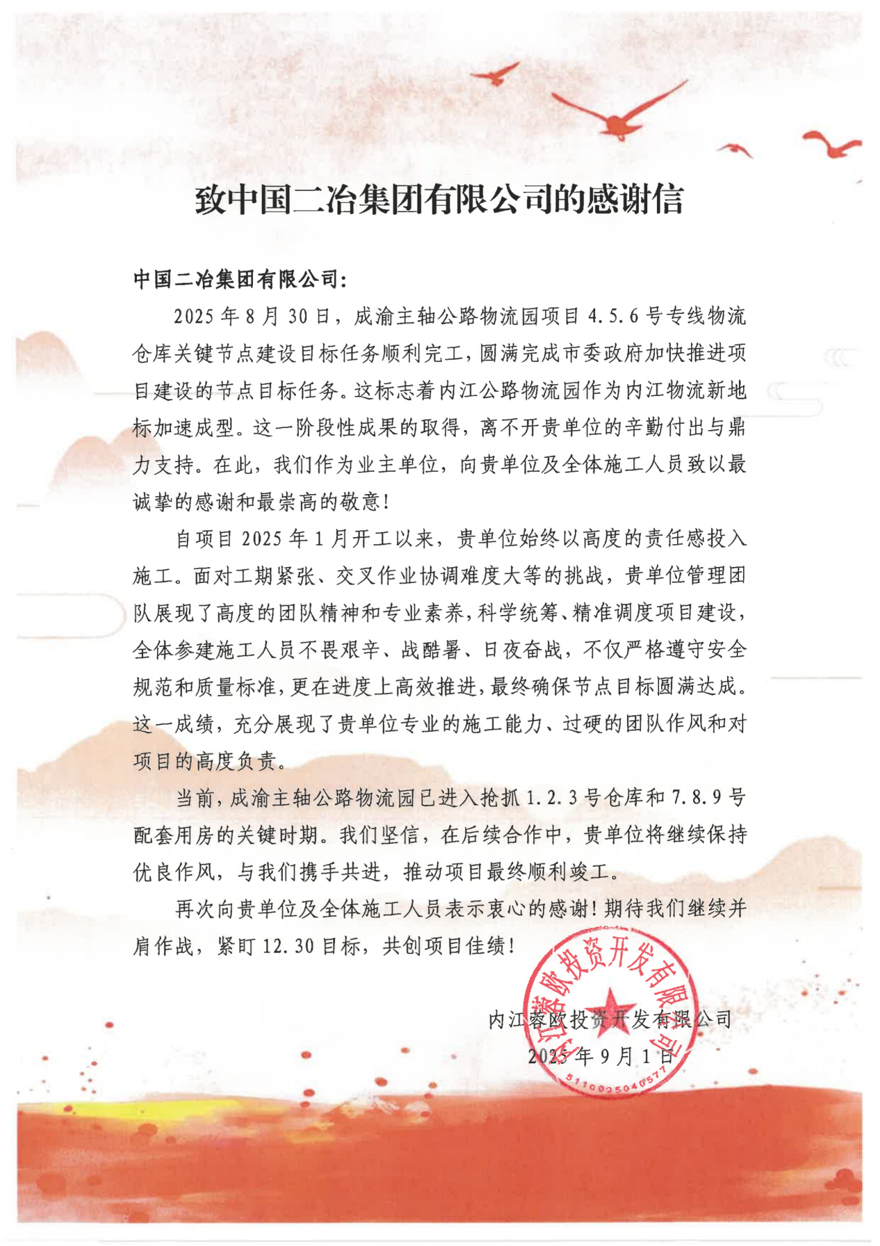 此封表揚(yáng)信不僅是對(duì)中國二冶項(xiàng)目團(tuán)隊(duì)的卓越表現(xiàn)的高度認(rèn)可,更是對(duì)中國二冶整體企業(yè)精神和綜合實(shí)力的有力肯定。這封信件不僅彰顯了中國二冶在復(fù)雜工程項(xiàng)目中的專業(yè)管理能力和高效執(zhí)行力,還體現(xiàn)了對(duì)合作伙伴關(guān)系的深度重視,進(jìn)一步提升了企業(yè)在行業(yè)內(nèi)的聲譽(yù)和影響力,為后續(xù)項(xiàng)目合作注入了強(qiáng)大動(dòng)力。